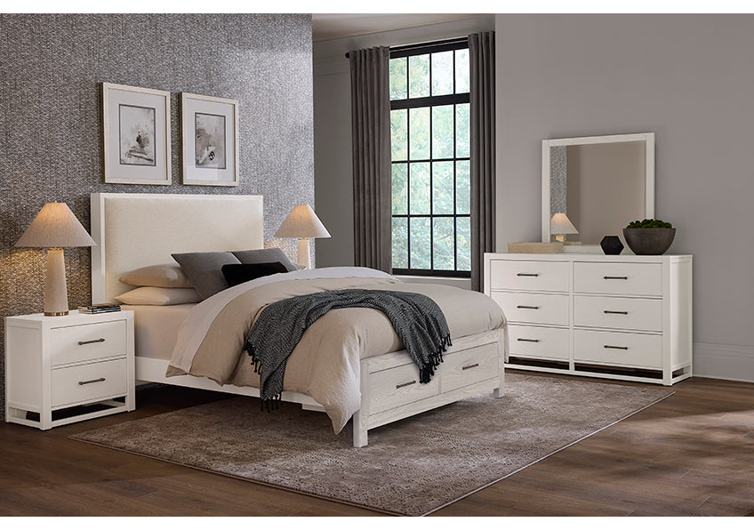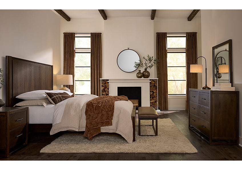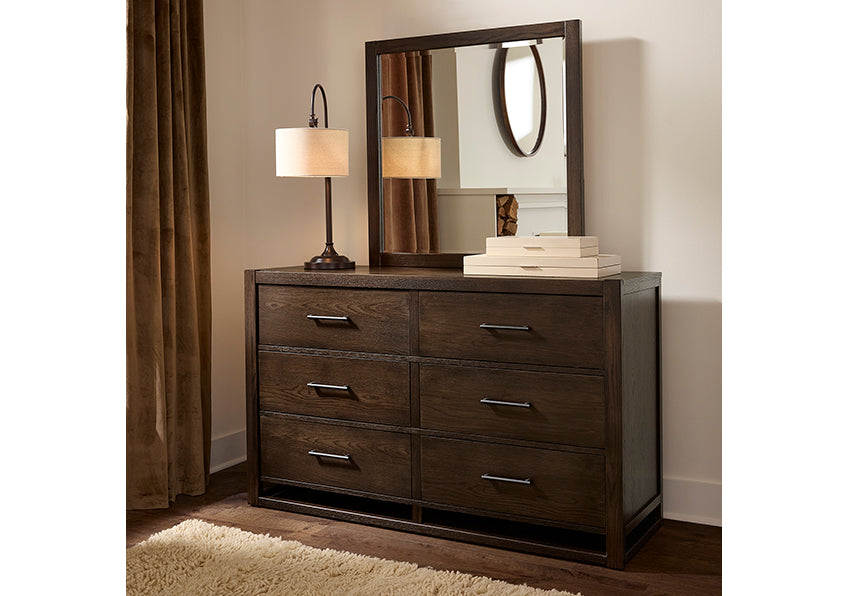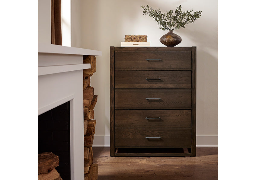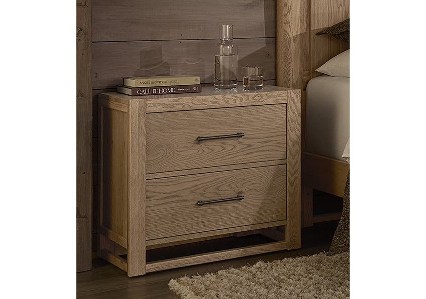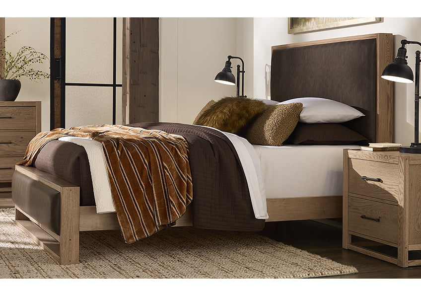 Introducing the Lodge & Loft bedroom collection from Vaughan-Bassett Furniture, a masterful blend of rustic lumber and modern lines, with every piece proudly made in the USA by American craftsmen and craftswomen. Each piece of Lodge & Loft features a blend of solid American Oak lumber and oak veneers. By using the finest American hardwoods, we are able to showcase the knots and bold grain patterns that are unique to white oak lumber, and which gives this bedroom collection an authentic, durable, and stylish feel.